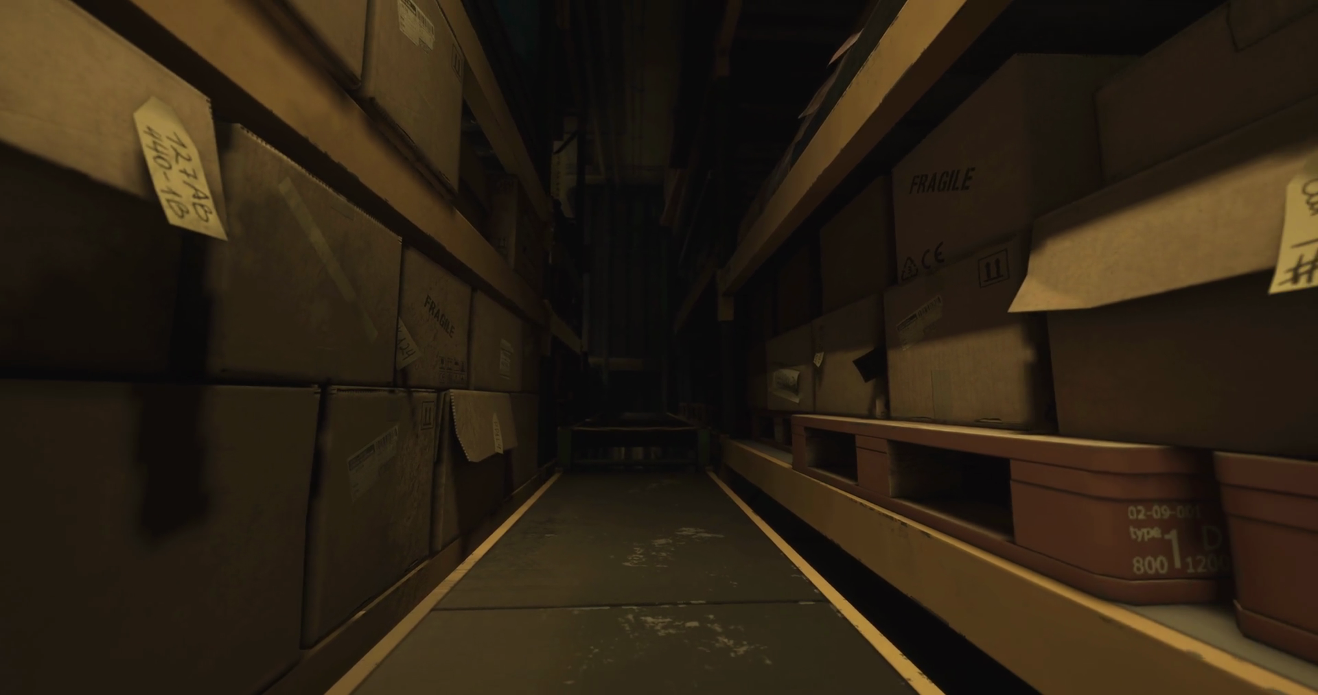 Mysterious Corridor In A Dark Storage Facility With Stacked Boxes And Shadows