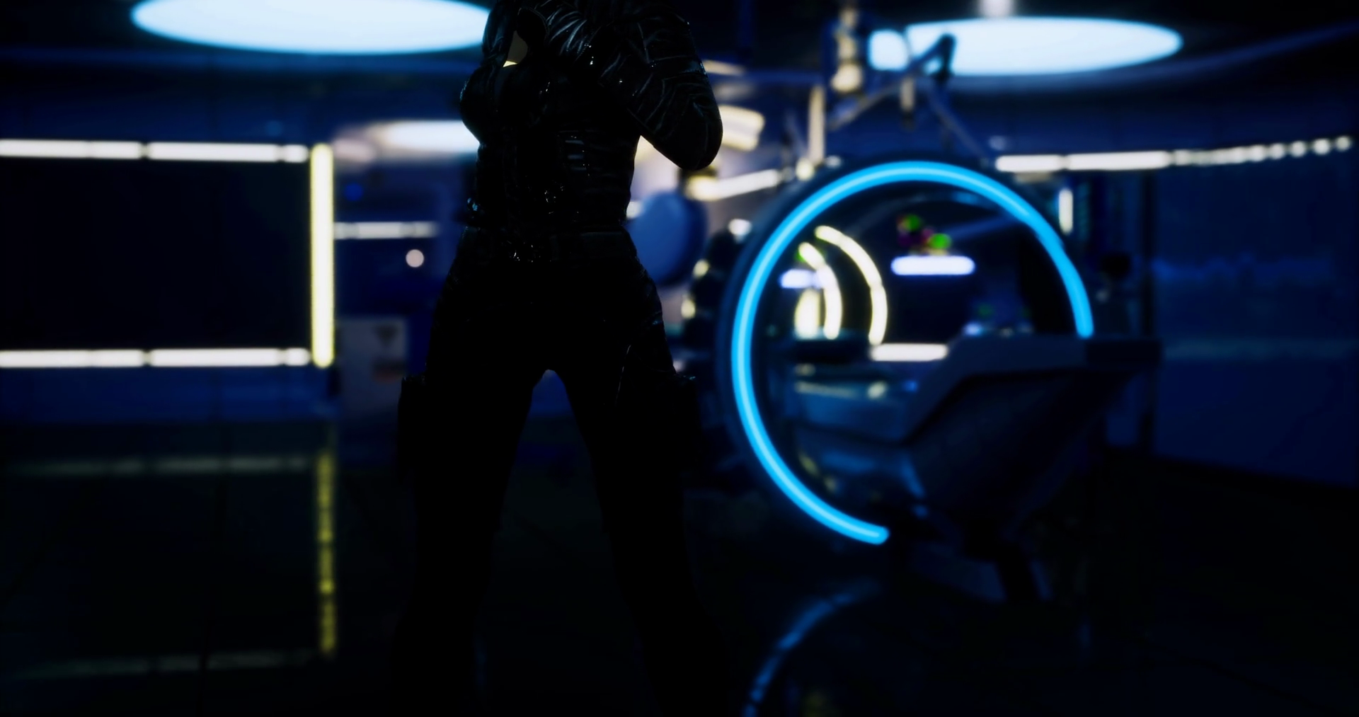 Mysterious Figure In Futuristic Lab Setting With Neon Accents At Night