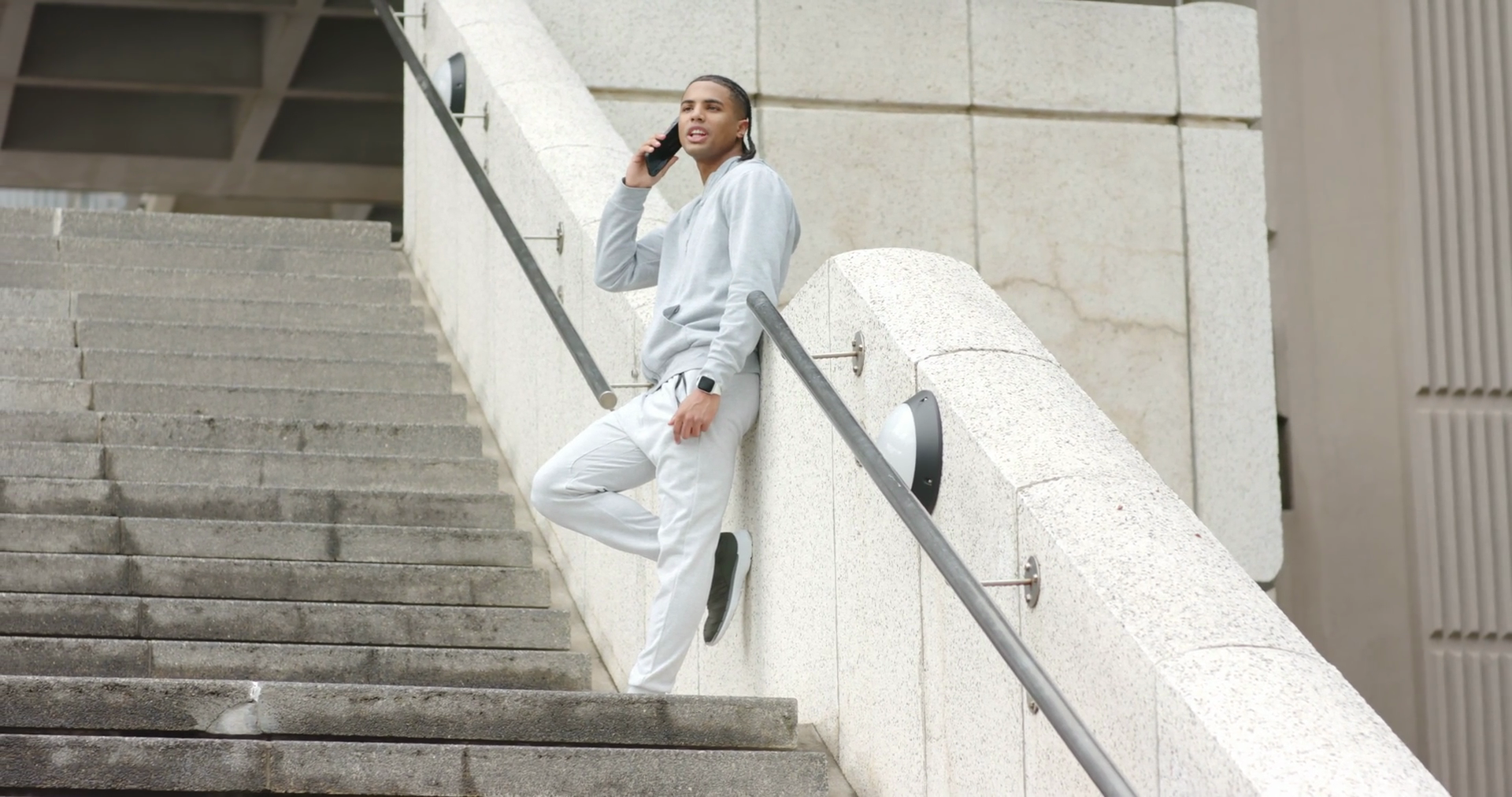 On Receiving Smartphone Call Man Leaning On Stairs Railing Nodding During Conversation Copy Space