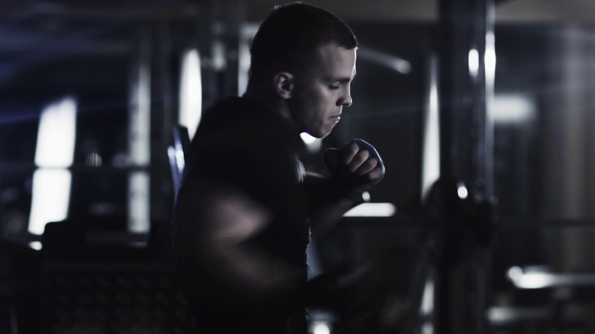 Professional Male Boxer Is Training Punches And Kicks In Dark Gym