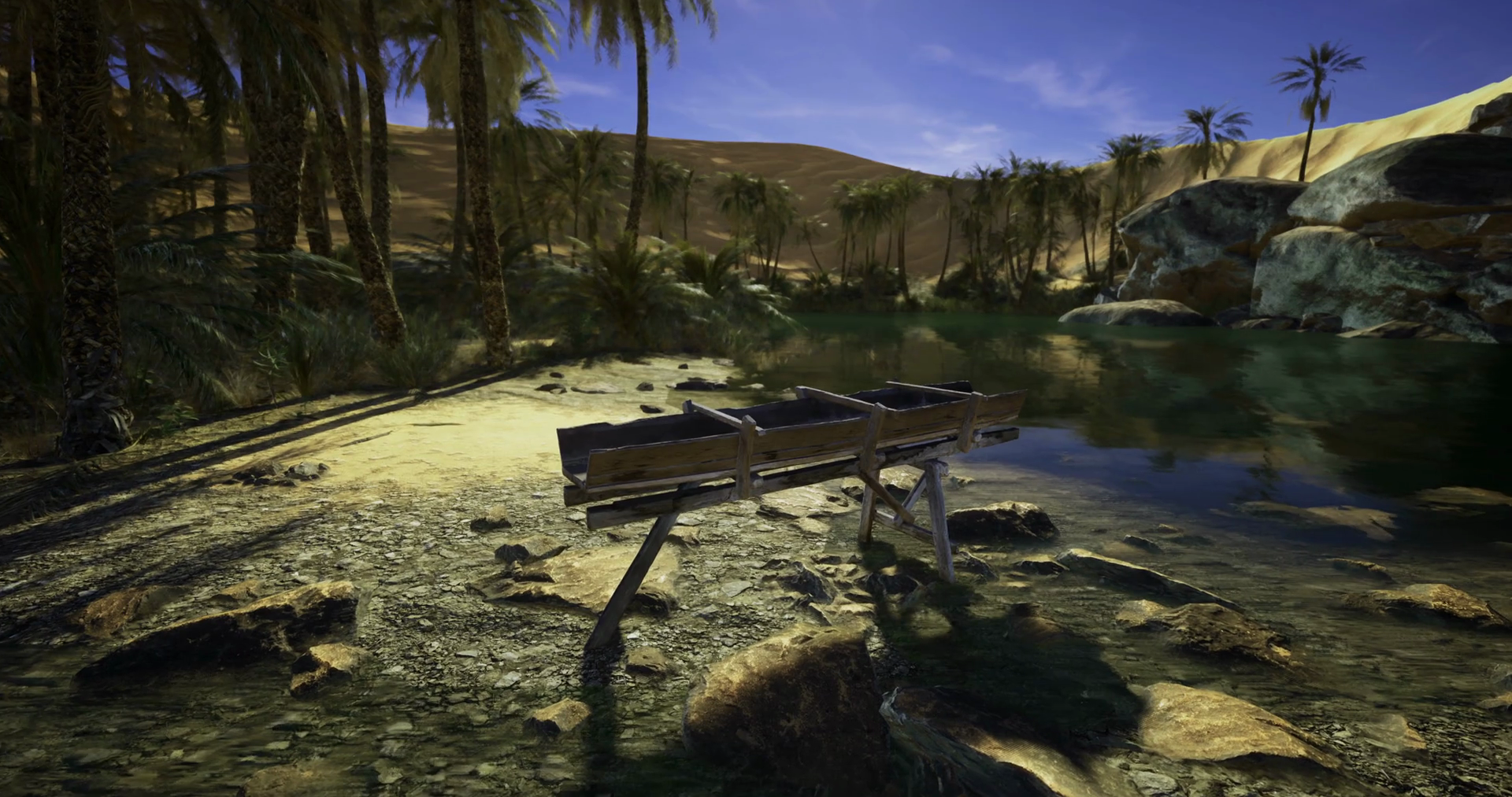 Relaxing Oasis With Palm Trees And Serene Water In Desert Setting