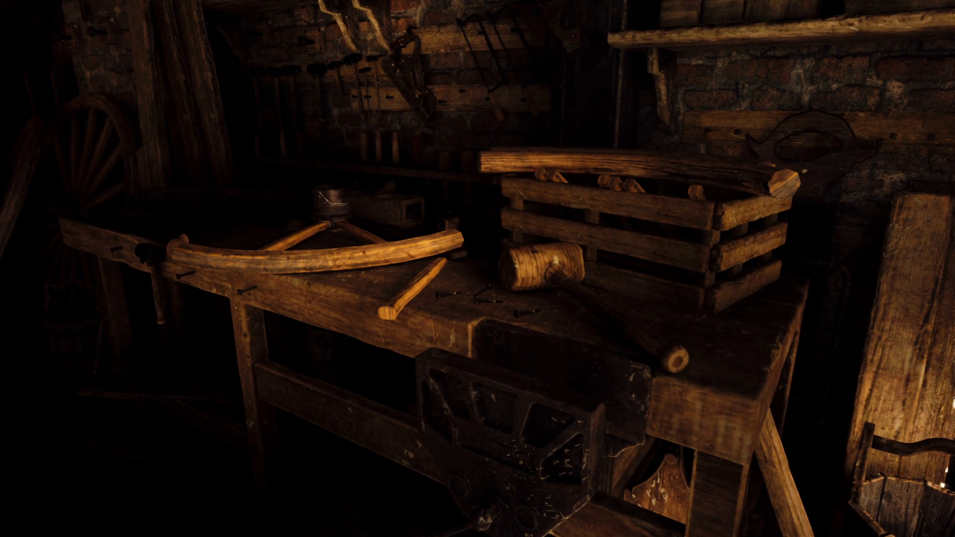 Rustic Workshop With Wooden Tools And Crates In Dim Light