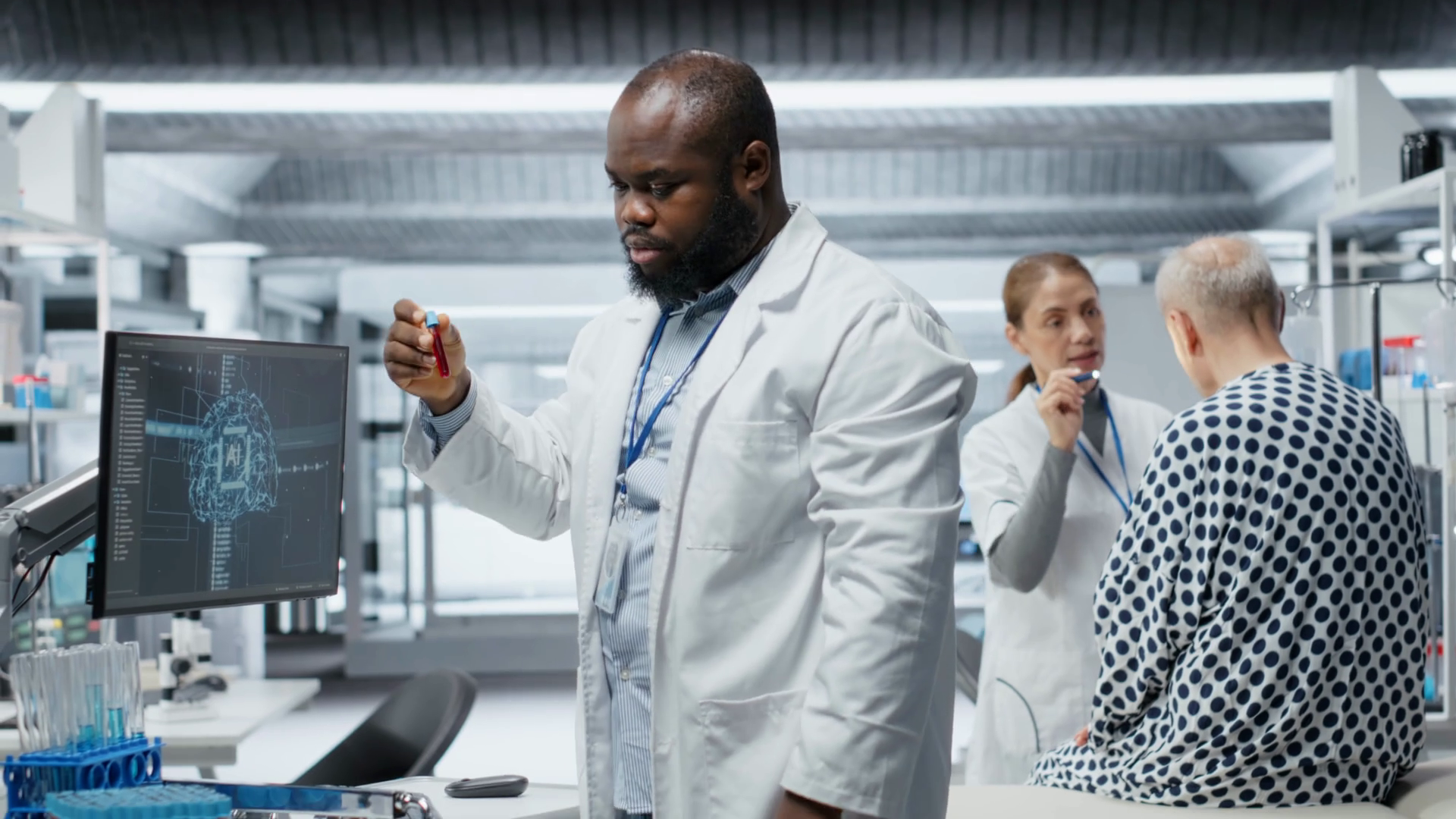 Scientist Performs Laboratory Experiment With Ai Tech Tools With Patient Drug Dosage And Potential Allergic Reaction Gathering Data For