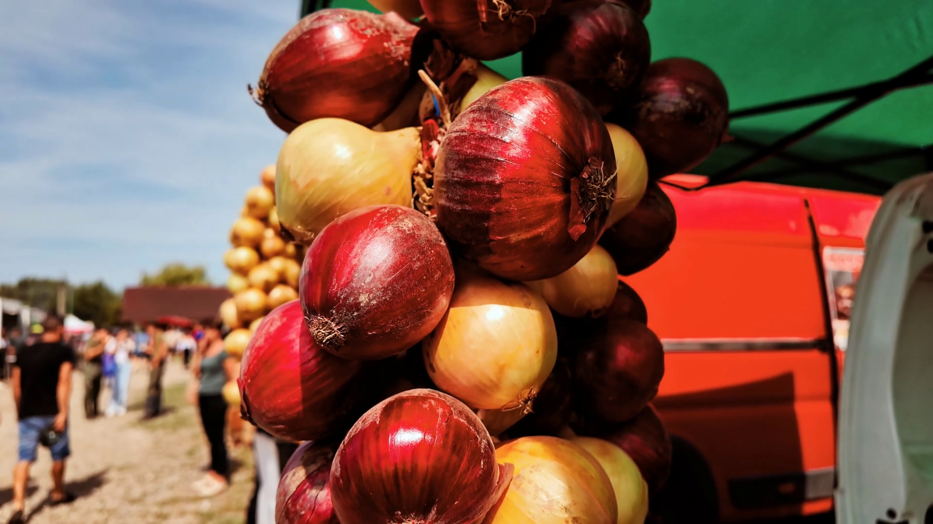 String Of Braided Red And Yellow Onions Close View Of Papery Skins Twisting Stalks And Rustic Texture