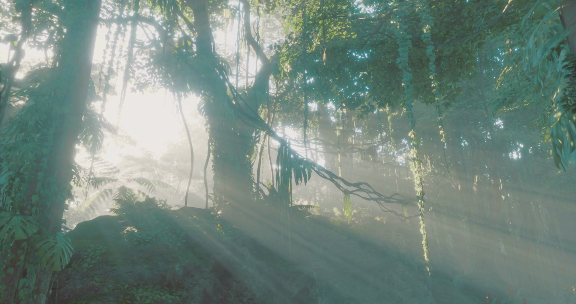 Sunlight Filters Through Dense Jungle Foliage In A Tranquil Forest Setting