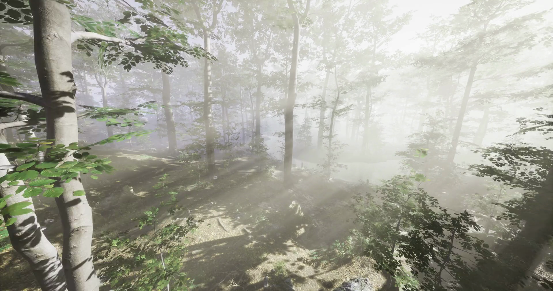 Sunlight Filters Through Misty Trees In Tranquil Forest Setting