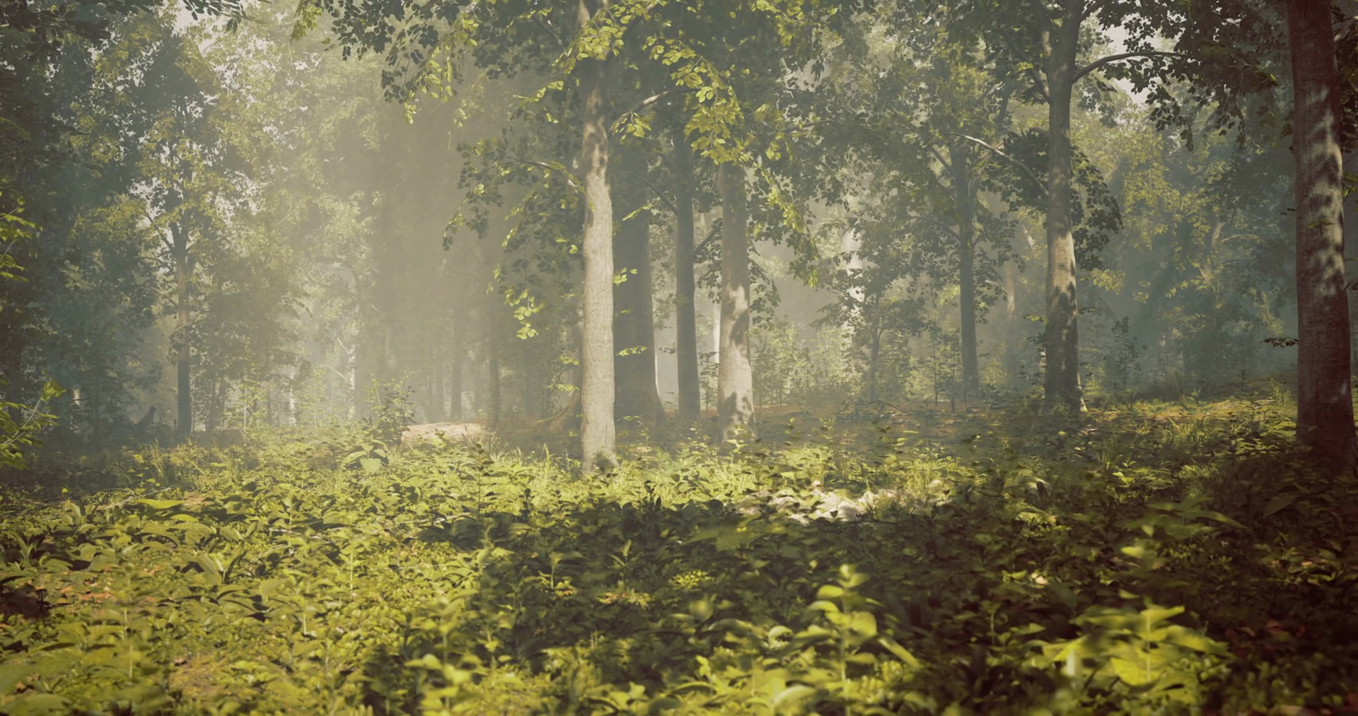 Sunlight Filters Through Tree Canopy In A Serene Forest Setting