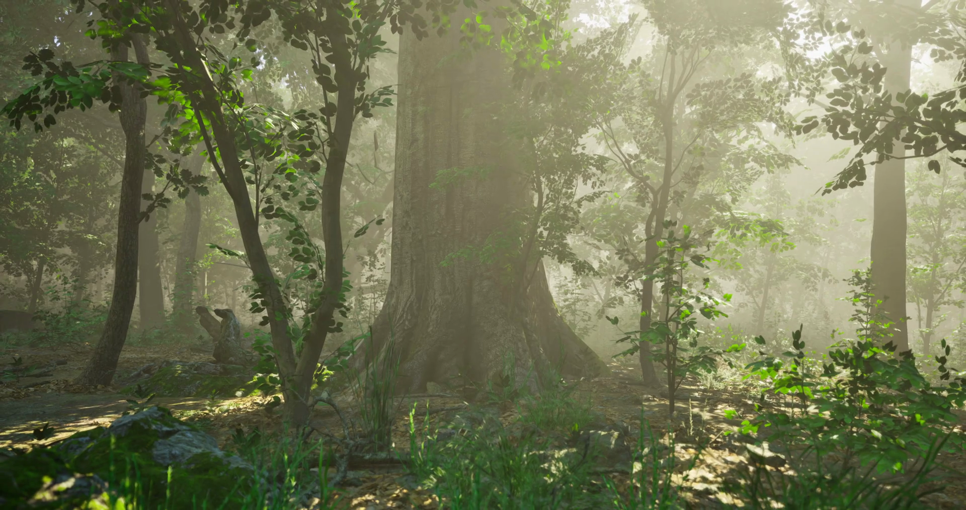 Sunlight Filters Through Trees In A Lush Forest During Early Morning Hours