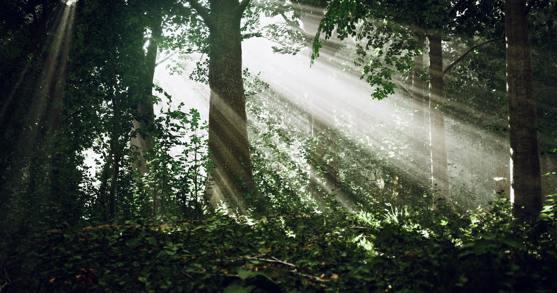 Sunlight Streams Through Trees Illuminating A Tranquil Forest In Morning Light