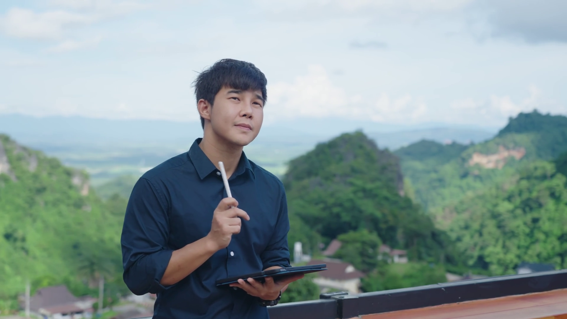 Young Asian Entrepreneur Brainstorming Ideas On Cafe Balcony With Mountain View