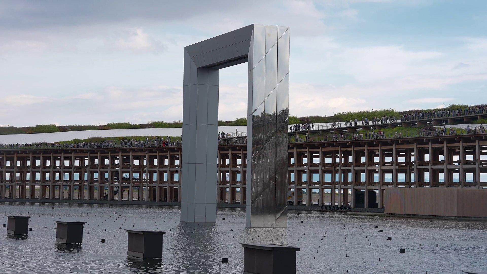 Wide View Shows A Metal Arch Over A Shallow Pool And A Wooden Lattice Pavilion At Expo 2025 In Osaka Japan Visitors Move On The Rooftop Path Water Show Elements Rest Below