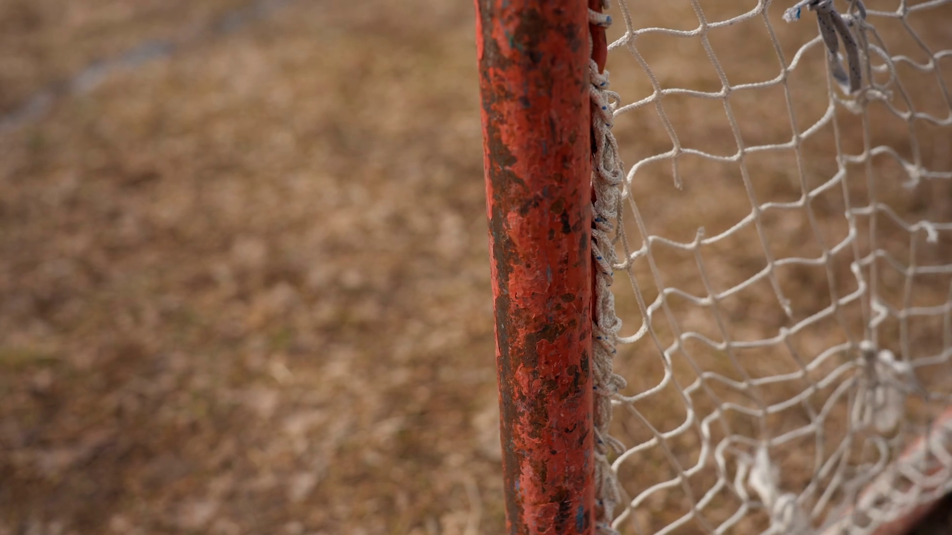 Worn Red Goal On Field Aged Scarlet Goal Frame With Frayed White Netting On Rustic Terrain Weathered Maroon Goalpost Featuring Tattered