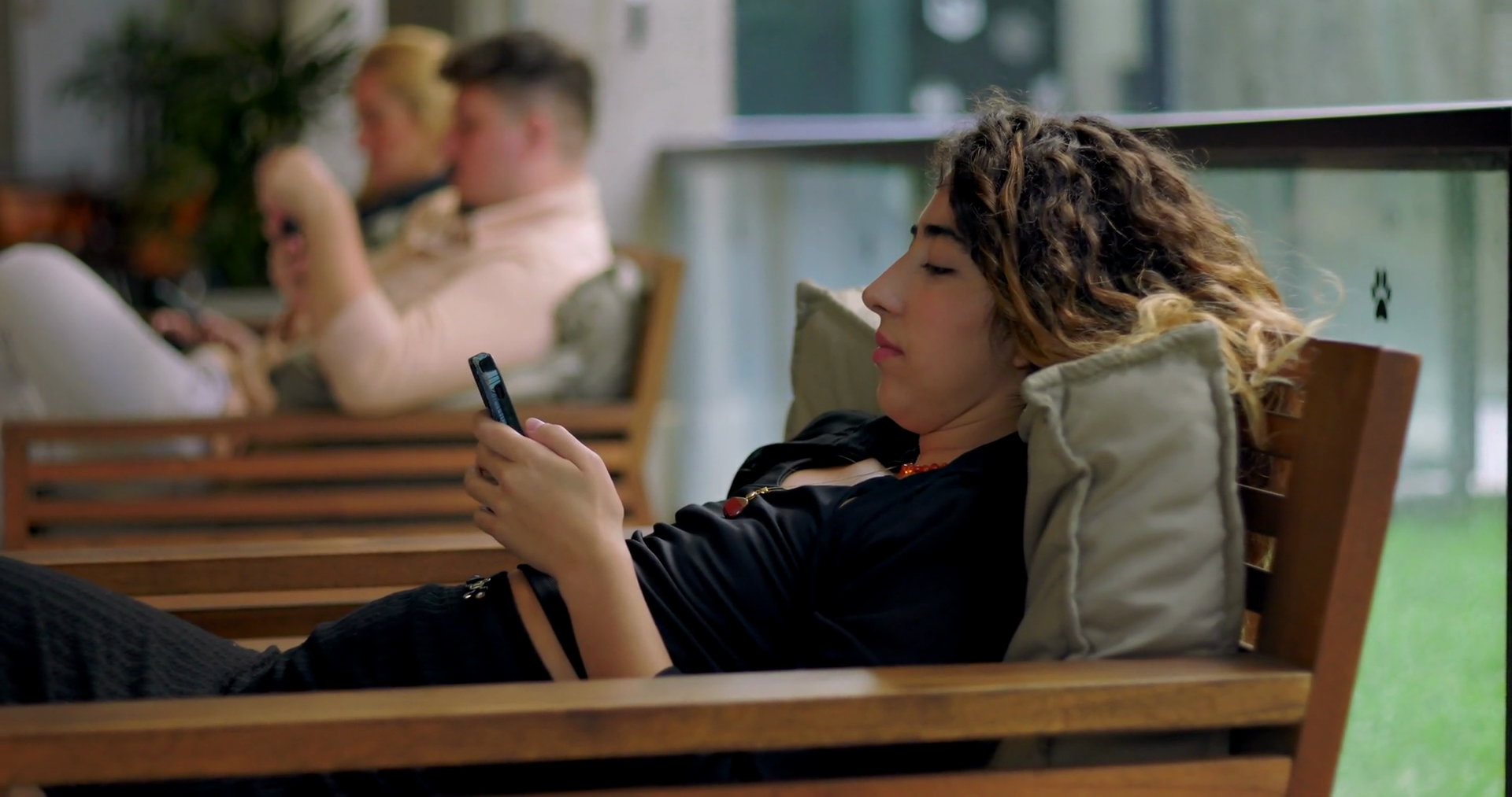 Young Woman Relaxing On Wooden Bench Using Smartphone Indoors With Two People In Background Using Mobile Devices In A Casual Shared Workspace
